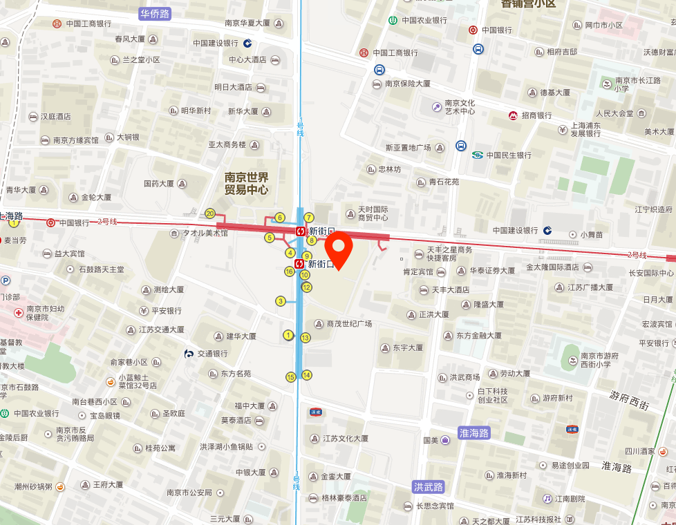 附近的地铁站: 距离地铁1号线和2号线的换乘站-新街口站100米 附近的公交站: 距离新街口东 - 公交站334米; 途经公交车: 1路 3路 5路 9路 25路 34路 34路区间 Y1路夜间 Y24路夜间 Y5路夜间 距离新街口·正洪街 - 公交站335米; 途经公交车: 2路 26路 27路 30路 46路 60路 距离新街口北 - 公交站338米; 途经公交车: 1路 16路 25路 28路 33路 34路 34路区间 35路 100路 Y1路夜间 距离新街口南 - 公交站345米; 途经公交车: 16路 27路 28路 33路 35路 100路 306路 Y16路夜间 距离新街口·石鼓路 - 公交站362米; 途经公交车: 18路 41路 302路 距离长江路·估衣廊 - 公交站511米; 途经公交车: 5路 27路 29路 60路 68路 Y24路夜间 距离王府大街·石鼓路 - 公交站550米; 途经公交车: 4路 43路 48路 83路 302路 Y4路夜间 距离新街口西 - 公交站575米; 途经公交车: 3路 4路 9路 18路 43路 48路 83路 302路 Y4路夜间 Y5路夜间
